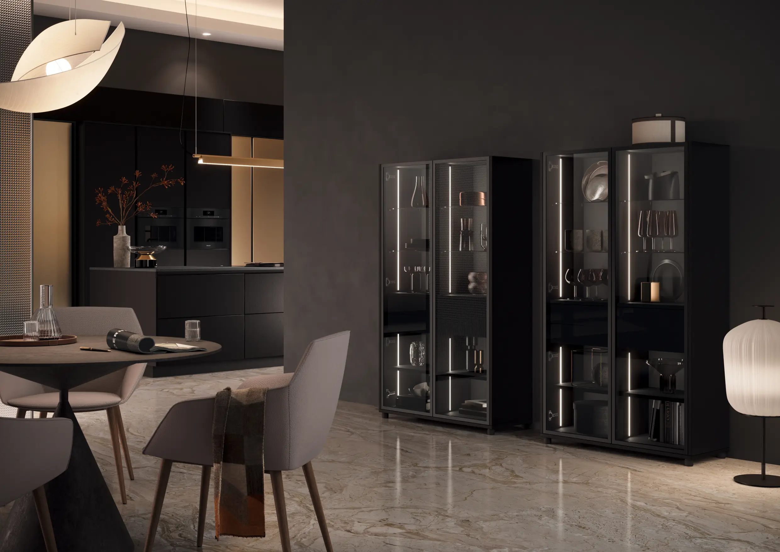 Glass also brings an element of atmosphere. When paired with internal lighting, it creates depth and warmth, particularly in the evening, when the kitchen becomes part of the wider living environment