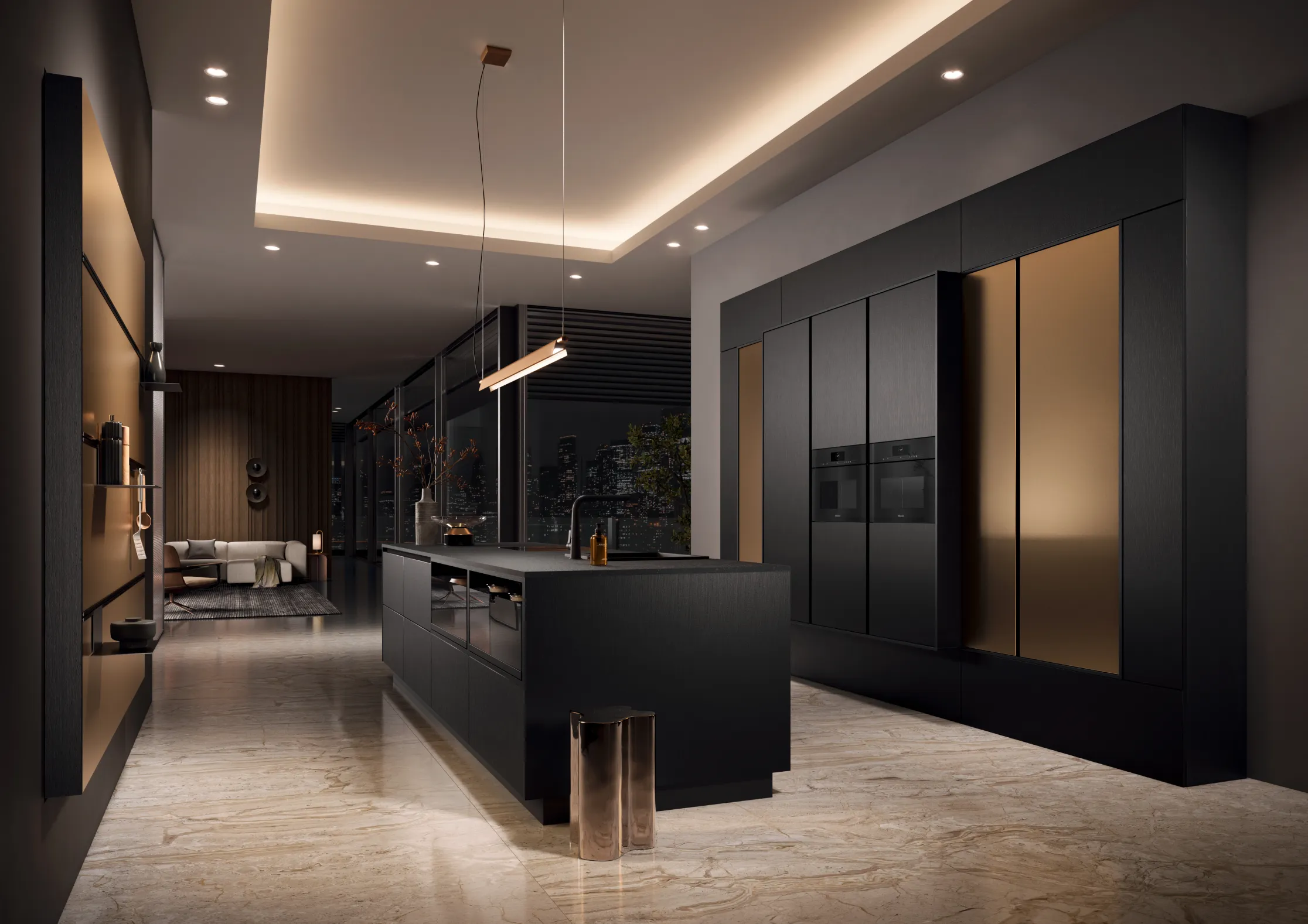 A design-led open-plan space often leans towards wood veneer or handleless lacquer, introducing warmth while maintaining visual calm across the wider living area.