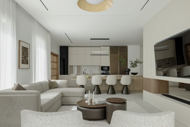 An open kitchen can be closed or partially separated using glass partitions, sliding doors, pocket systems or architectural zoning solutions that maintain light while improving privacy.